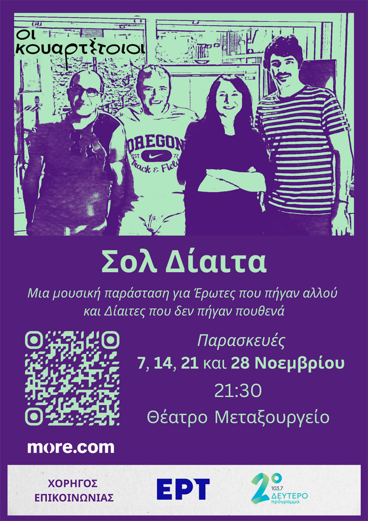 Παρασκευές 7, 14, 21 και 28 ΝοεμβρίουΜε παχουλά λογοπαίγνια και πειρά(γ)ματα της γλώσσας, «Οι Κουαρτέτοιοι», σε μουσική του συνθέτη Νίκου Πλατύραχου και στίχους της ηθοποιού Τίνας Γιωτοπούλου, συνθέτουν μια σατιρική μουσική παράσταση με τίτλο «Σολ Δίαιτα», σε σκηνοθετική επιμέλεια του Γιώργου Τζαβάρα, για όλες τις Παρασκευές του Νοεμβρίου στο θέατρο ΜΕΤΑΞΟΥΡΓΕΙΟ.