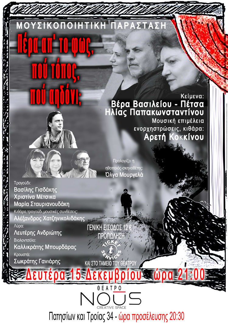 Δευτέρα 15 ΔεκεμβρίουΟι ποιητές, Βέρα Βασιλείου - Πέτσα, Ηλίας Παπακωνσταντίνου και η συνθέτις Αρετή Κοκκίνου παρουσιάζουν τη μουσικοποιητική παράσταση «Πέρα απ' το φως, πού τόπος, πού αηδόνι;» στο θέατρο ΝΟUS τη Δευτέρα 15 Δεκεμβρίου.